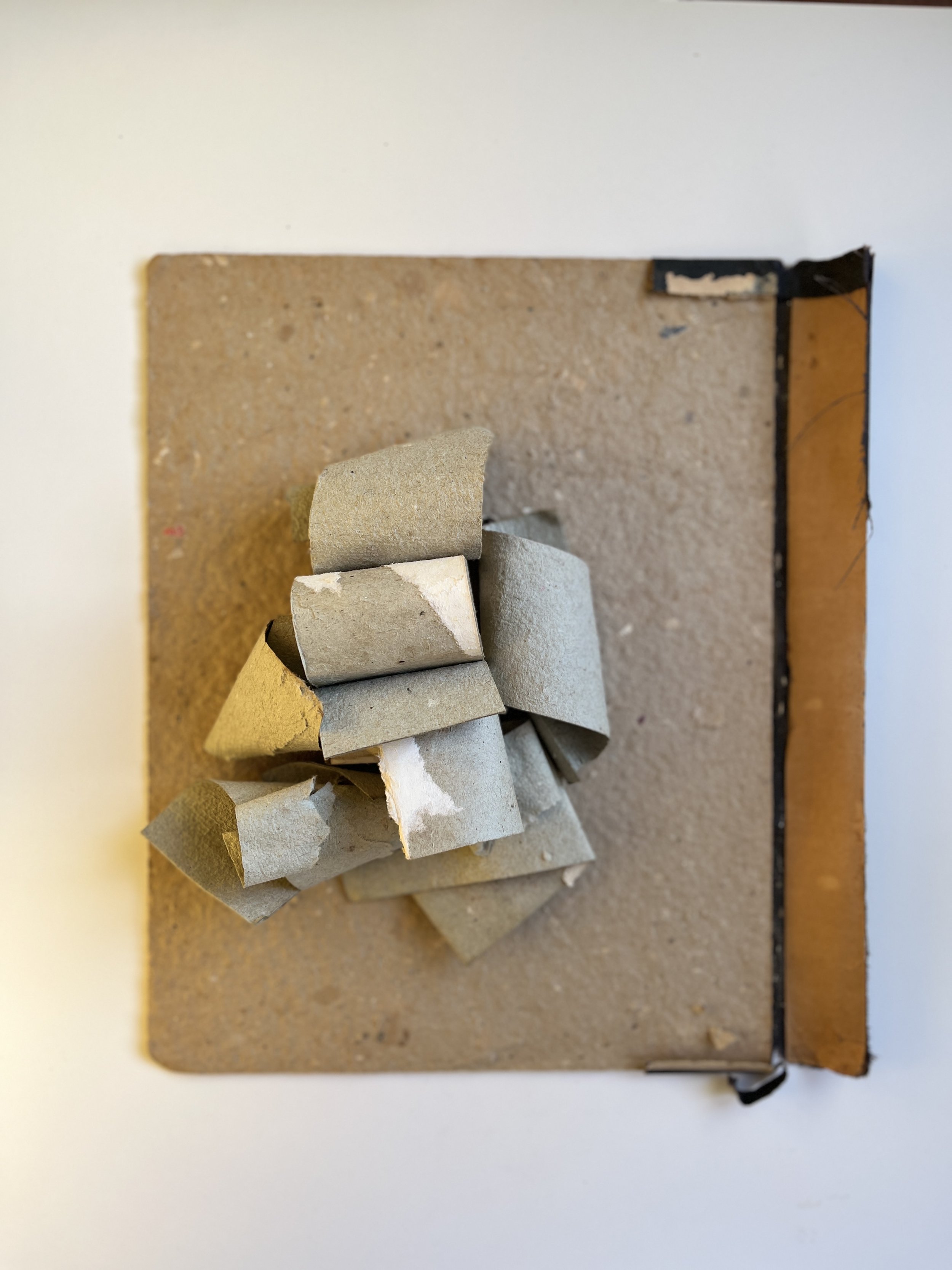 Day 26 We are creating a landscape using the technique of tearing, folding, and digging. I used a cover that can be disassembled when dry. After separating several layers, I created a substrate. From the separated layers, I formed a landscape route, resembling geological folding. In between the layers, I found threads and attached pieces of paper, leaving them in their authentic state. I created a channel in the crease, part of which was dug, forming deep holes and channels. Using the same binding, I fashioned boulders of various sizes, placing them randomly. The geological concern is omnipresent, taking different forms, partly visible and partly hidden. Worry represents a diversity of thoughts that resurface repeatedly, accumulating on top of each other. The boulders are stacked as a consequence of geological activity, and the wrinkling creates geological forms beyond our control. The result is visually apparent. Size – 28x21x7 Medium - paper