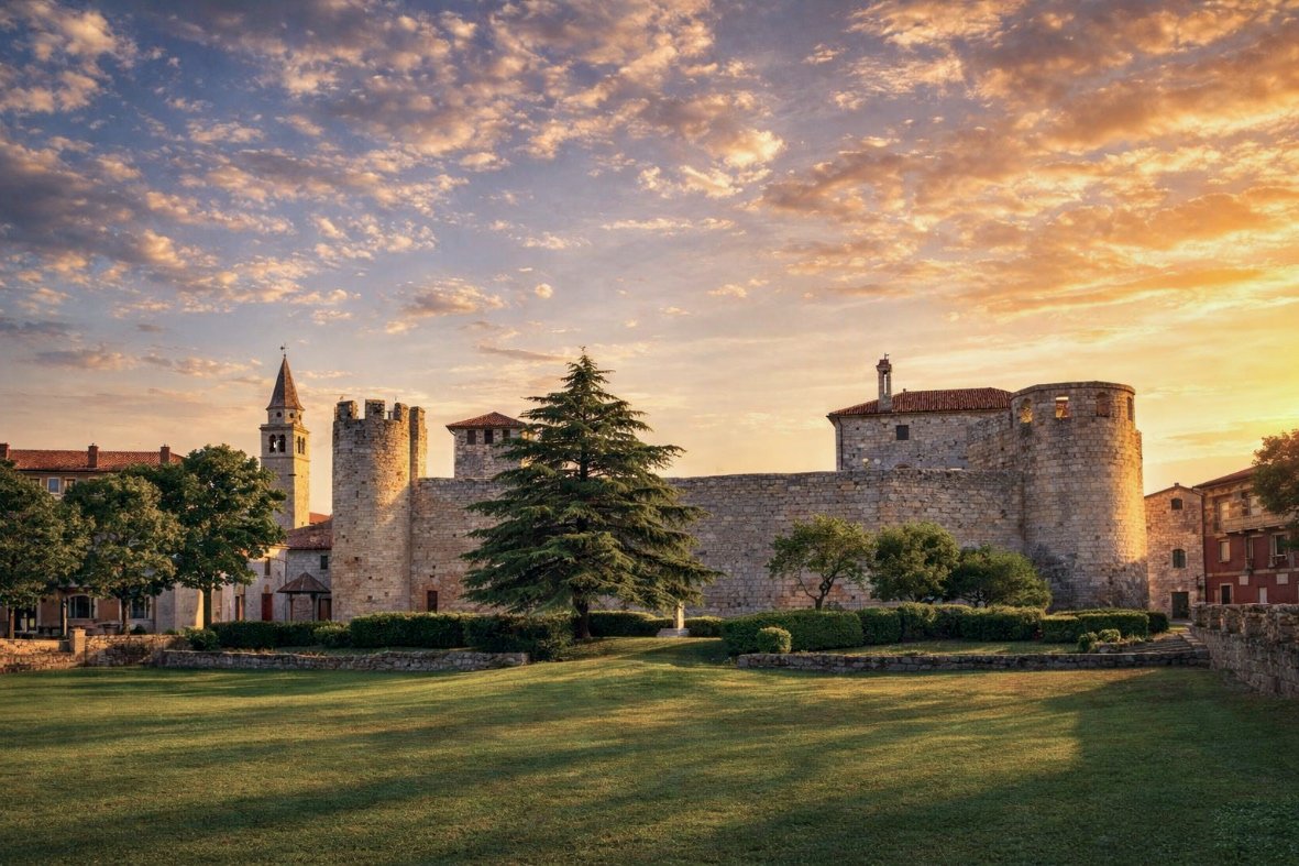 At its center lies the main square, Placa, dominated by the Morosini-Grimani Castle, one of the most important and best-preserved Venetian fortifications in Istria. The castle, continuously rebuilt, transformed, damaged, and restored from the 13th century onward, stands today as a physical record of time—architecture carrying memory, adaptation, and survival. Its walls, towers, inner courtyards, and surrounding public spaces form a strong spatial presence rather than a narrative backdrop.